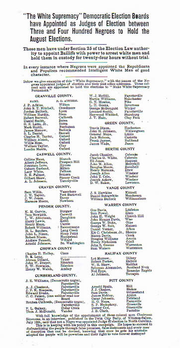 The reader is encouraged to read our "White Supremacy" page to understand what the term meant in 1898, and its misinterpretation today. The campaign broadside found below shows that white Democrats did indeed include black citizens in their efforts toward responsible government in North Carolina, and that they encouraged black participation (See Josephus Daniel's quote below).